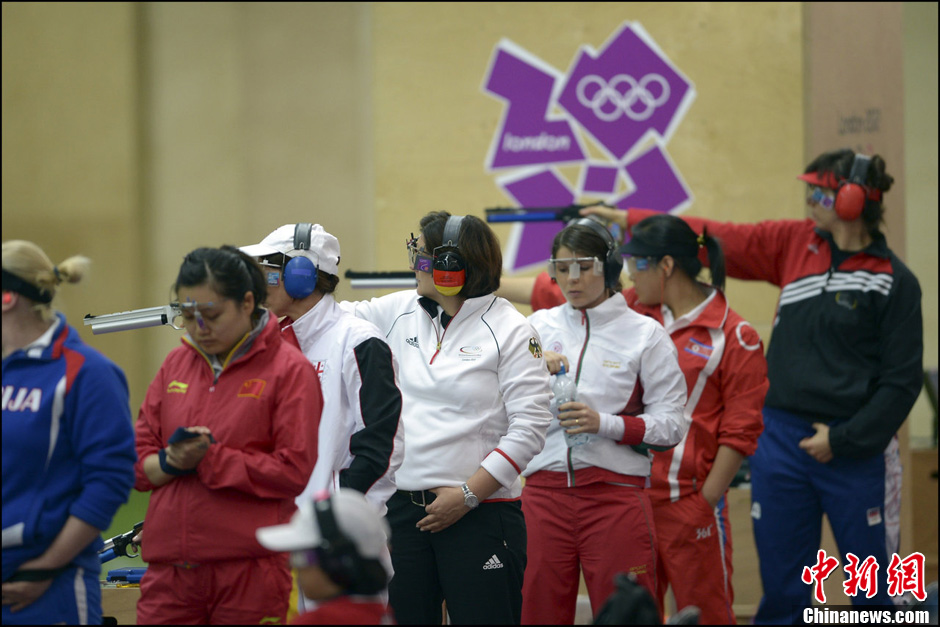 倫敦奧運會射擊比賽,女子10米氣手槍預賽,衛冕冠軍郭文珺打出388環排在第一,蘇玉玲386環列第四,兩人攜手晉級決賽。圖為郭文珺在比賽中(左二)。