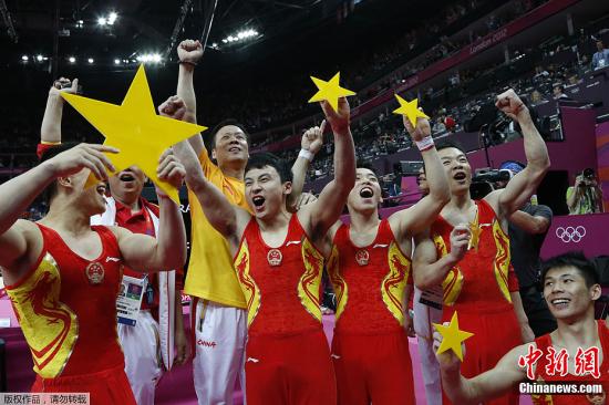 當(dāng)?shù)貢r(shí)間7月30日,奧運(yùn)體操男子團(tuán)體決賽在北格林威治體育館打響。中國隊(duì)以總分275.997的成績衛(wèi)冕成功。圖為男團(tuán)選手組“五星”。