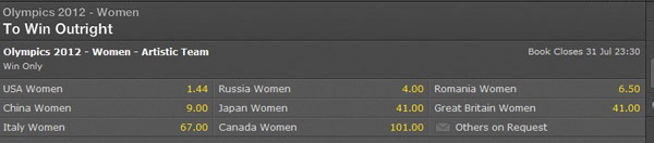 北京時間7月31日,2012年倫敦奧運會將展開體操女子團體決賽的爭奪,著名體育博彩公司bet365為各支參賽隊伍開出了奪冠賠率。美國隊以1.44排在首位,領先優勢明顯,緊隨其后的是賠率為4的俄羅斯隊,衛冕冠軍中國隊僅以9排在第四位,在博彩公司的眼中,中國隊衛冕成功的可能性微乎其微。