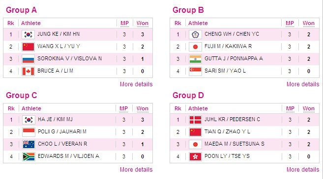 女羽雙打4個組的戰(zhàn)績結(jié)果:每個小組的前2名出線