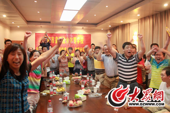 李曉霞獲得女單冠軍。校長劉凱揮著雙臂高喊:“今天就是過年!都別走!上酒!”(馬鑫 攝)