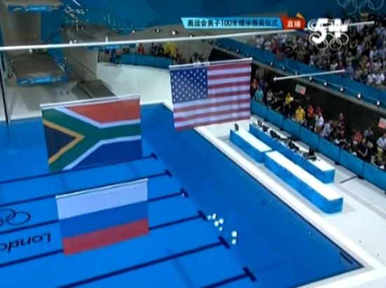 倫敦當地時間8月3日晚,倫敦奧運會男子100米蝶泳結束決賽的較量,菲爾普斯強勢奪金,而南非選手勒-克洛斯和俄羅斯選手科羅特什金并列獲得銀牌。奧林匹克水上中心的頒獎儀式上,同為亞軍的俄羅斯與南非國旗一下一上排列徐徐升起,重現了孫楊與樸泰桓在200米自由泳并列亞軍后,中韓國旗一下一上的那一幕。