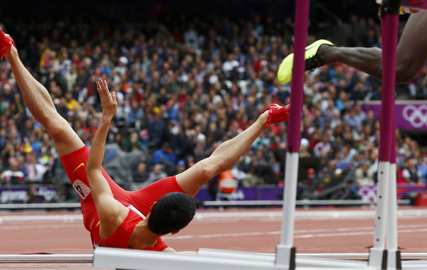 北京時間8月7日下午,在倫敦奧運會男子110米蘭的預賽中,劉翔因受腳部傷勢影響,重重的摔倒在地上,無緣半決賽。