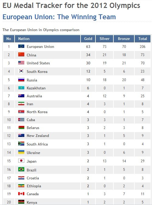 按照medaltracker.eu的計算,將所有歐盟國家都算在了一起。這樣以來,有27個成員,5億人口的歐盟,將英國、法國、意大利、德國、荷蘭等獎牌大國的獎牌數計算在了一起,總計達到了63塊金牌,73塊銀牌和70塊銅牌,在獎牌榜上遙遙領先中國目前為止的34枚金牌和美國的30枚金牌。
