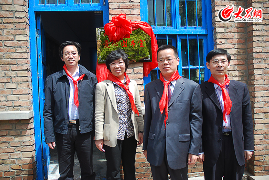 大眾網董事長、總經理林忠禮,齊魯書社總編輯昝亮,禹城市人大常委會第一副主任李玉梅,禹城市市委常委、宣傳部長閆秀麗一起為愛心圖書室揭牌。(大眾網記者 王長坤 攝)