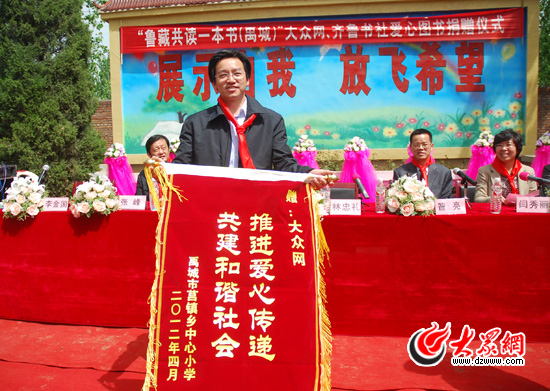 大眾網董事長、總經理林忠禮在捐贈儀式上發表講話,他說,今天我們在禹城拉開了2012年“魯藏共讀一本書”活動的序幕,這是“魯藏共讀一本書”這一公益品牌活動重要組成部分。大眾網作為全省最大的新聞、外宣門戶網站,始終注重和強調媒體的公信力,積極履行各項社會責任,一直致力于各項社會公益活動的資助開展。其中,近2年來,僅愛心圖書捐贈一項,就已經在全省捐建愛心圖書室5所,弘揚了重視教育、尊重知識、鼓勵成才的社會風氣。在此,我們也呼吁更多的社會力量參與到“魯藏共讀一本書”這一公益平臺中,讓我們攜起手來,一起實踐“倡導全民閱讀,實現知識共享,推進愛心傳遞”這一公益理念。