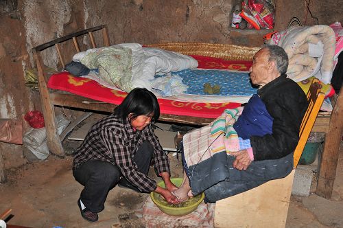 高長青家有三畝半地,僅夠一家人生活。她一個人下班后還要在田里摸爬滾打,刨地、澆水、除草。家里沒有更多的經濟來源,全家里里外外的活都壓在了她身上。每天凌晨6點多,就起床給婆婆和上學的兒子做飯,因為她知道,自己白天要下田干活,不早點把這些準備好,婆婆就要餓肚子,兒子上學就會遲到……等到家里的事忙完后,她顧不上坐一會,又背著背簍下地了,地里的花生正等著她照理,紅薯等著她栽種……中途還要回來服侍婆婆上廁所、翻身、喝水。