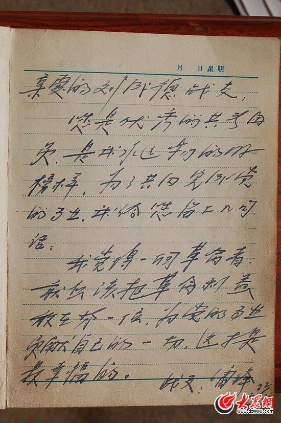 1962年2月,劉成德作為師部推薦的英模代表,參加了沈陽軍區(qū)首屆共青團員代表大會。會上,雷鋒與劉成德等代表在主席臺就座。雷鋒得知劉成德的事跡后,非常感動。當(dāng)即給劉成德寫下:“您是優(yōu)秀的共青團員,是我永遠學(xué)習(xí)的好榜樣。為了共同完成黨的事業(yè),我給您留下幾句話:我覺得一個革命者,就應(yīng)該把革命利益放在第一位,為黨的事業(yè)貢獻自己的一切,這才是最幸福的。”