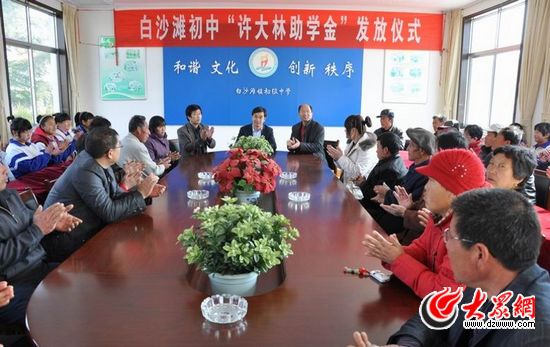 2008年,打拼了三年的建筑公司開始有了比較穩定的效益,他就和白沙灘鎮初級中學協商,每年拿出4萬元,在學校設立“春華助學金”,資助30名家庭貧困但品學兼優的學生,并承諾,這些受資助的學生以后讀大學,讀研究生,就是到國外留學,只要他有能力,就一助到底,直至畢業。有的家長不過意,逢年過節送些土特產給他,都被他婉言拒絕。他說,這些家長生活本來就苦,接受禮物,會增加他們的經濟負擔。如今,許大林資助的貧困學子已達120名,絕大多數學習成績位居班級前列。