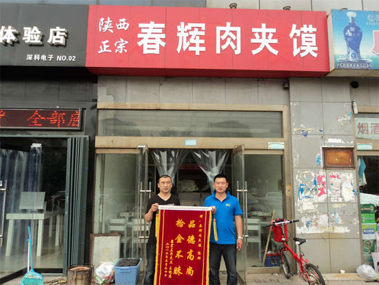 5月23日早上四點多鐘,住在勝宏辰軒的“春暉肉夾饃”老板張輝到車庫開車忙著去張羅店面生意時,突然發現旁邊車頂上有一個棕色錢包,找開一看內有4000余元現金及身份證、銀行卡等物品。當時天微微見亮,小區內寂靜一片,附近也并無一人,此時張輝急于處理店面事宜且無法及時與失主聯系,等物業前臺上班后,張輝急忙趕回辰軒小區請物業服務中心協助尋找失主,恰巧物業也曾接到過失主的救助咨詢電話。如此一來,物業服務中主很快幫忙聯系到了失主。看到自己的錢包能夠完璧歸趙,失主欣喜萬分,對張輝也是萬分感激。后失主將“拾金不昧  品德高尚”的錦旗和1000元現金送往張老板店里,表示自己的感激之情,張輝拒收了現金,笑著說:“這是我應該做的。”