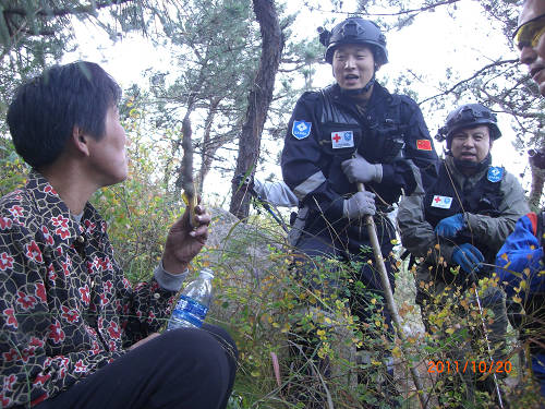 譬如2011年10月23日中午11點10分,李延照同志帶領青島藍天救援隊的隊員們正在太和山上做山地救援演練。還沒等結束,就收到青島市紅十字會電話救援指令:華陽澗位置有多名驢友被困,原因是有一位老太太小腿意外骨折。接到救援指令后,他們迅速收拾裝備,以最快的速度攜帶裝備向山下停車位置集結,就在集結過程中,天開始下起了雨。雨水或許會造成更麻煩的后果,例如山谷中的洪水或傷者傷口的二次感染等。時間就是生命,他們一邊向事發地趕一邊聯系受困游客,讓其中體力好的先下山兩到三人作為接應。等他們抵達事發地山腳的時候,雨已經越下越大,為了盡快把遇險群眾救助下山,已經顧不上帶雨具,按照在路上的分工,隊員們下車攜帶救援裝備就沖進雨霧。上到半山腰時遇到了麻煩,前方隊員電臺傳來呼叫,遇到一面大約60度的陡坡,一會兒回撤時傷員可能無法下運。李延照同志在指揮部告知一線隊員,首先保障自身安全,其次,留下兩名隊員,利用繩索搭建索橋,先找傷員。