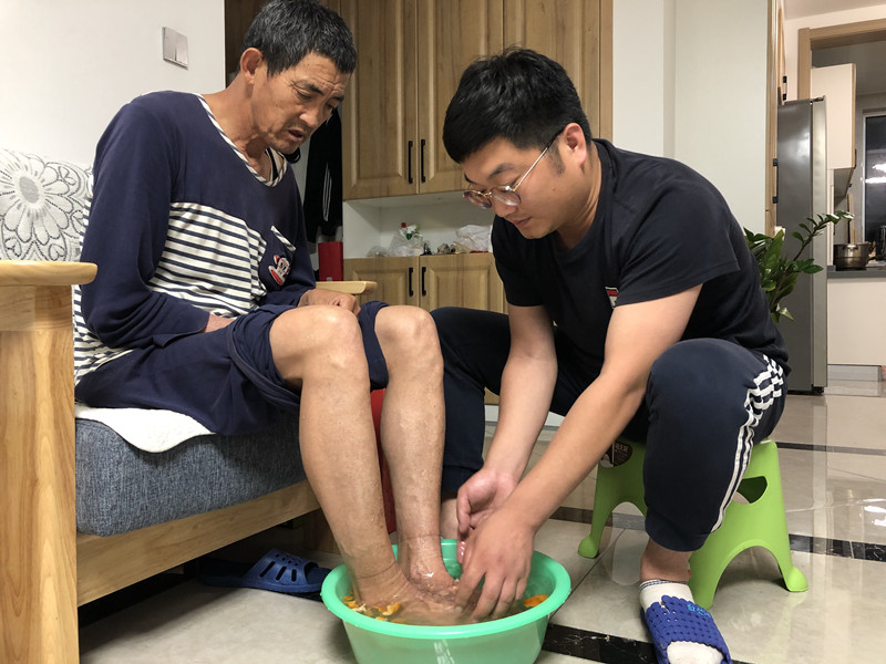 2019年大爺后遺癥的日漸嚴重,一天早晨起來之后,大爺突然開始口齒不清,右側腿和手也不大會動了,這可把鄭剛嚇壞了,趕緊帶大爺到醫院進行全身檢查,最后查出是小腦萎縮,需要住院治療。住院期間大爺變得脾氣更加暴躁,不配合醫生的治療,見到有人來就會拉著對方的手痛哭一陣,拒絕治療。這個時候,大小伙子硬是“趕鴨子上架”的當起了“保姆”,喂飯、洗頭、洗腳、洗澡、穿衣、接屎接尿,這些繁雜瑣碎的事情成了每天日常生活的必修課。即便他是新手上路,大爺的吃喝拉撒無一不安排得妥妥當當。看著大爺難過又痛苦的樣子,鄭剛心疼極了。醫生說,有幾種進口藥,效果好,但是價格昂貴。鄭剛想都不想就讓醫生用藥,完全不顧自己房子貸款還沒找著落的事兒。平時恨不能一分錢掰成兩半花的鄭剛,給大爺買營養餐卻從不含糊:鲅魚水餃、海鮮粥、牛肉包……每次大爺示意讓他吃,他總騙他吃過了,其實肚子里的大鼓敲的正響呢!同病房的人都羨慕的說:“你兒子太孝順了!”老人家藏不住臉上的幸福,用只有他自己能懂的話語含糊不清的描述著:“我侄兒……就是我兒…….”住院期間,鄭剛連著幾天幾夜沒合眼,吃飯也沒按頓吃,他的老胃病、痛風又犯了,疼的汗珠滿頭滲出,又怕大爺看出來,只能一遍遍說,天太熱,天太熱了……有一天晚上他實在太累了,俯身趴在大爺床前迷糊了一會,朦朧中感覺有人摸他的頭,抬頭一看是大爺醒了,老人家紅著眼睛,用含混不清的話告訴他:“累了,回......吧……”鄭剛握著大爺的手,哽咽著說不出話來。