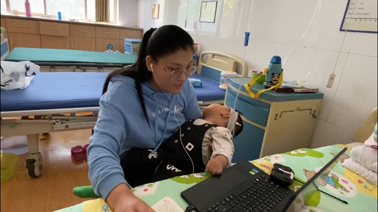 商萃萃說,孩子剛住院的前幾天,情況比較嚴重,每天從早上九點一直到下午四點都需要輸液治療,基本占據了整個白天的時間,因為孩子年齡太小,平時只能抱在懷里安撫情緒。由于網課時間和孩子輸液時間交叉,為了克服困難,商萃萃便一邊抱著正在輸液的孩子,一邊給學生們上課。每天晚上,商萃萃還要起來數次給孩子測量體溫,觀察孩子的情況。同時,為了不耽誤學生們第二天的課程,商萃萃只能趁孩子熟睡時抓住有限的時間備課、給學生批改作業。