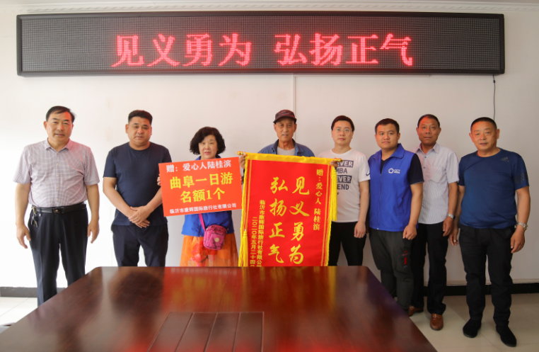 陸桂濱沒有把救人的事告訴其他人,直到同行的導游把他的事向公司匯報后,公司領導才知道這一見義勇為事跡。于是旅游公司通過聯系宋家王莊社區給陸桂濱送去了“見義勇為 弘揚正氣”的錦旗,并邀請陸桂濱免費參加曲阜旅游活動。