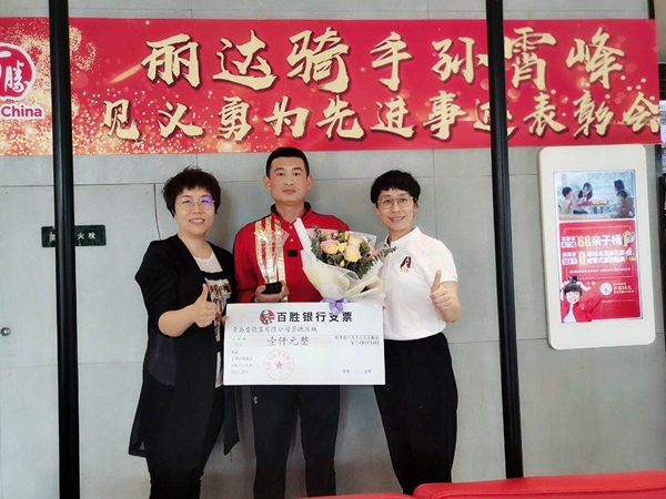 7月16日,孫霄峰再次接到盛女士求助電話,他立即趕往老人家,因敲門無人應答,孫霄峰與盛女士開啟了視頻通話,并在盛女士的指引下進入家里。這時,孫霄峰發現老人趴在衛生間地上,便趕忙將老人抱到沙發上,用毛巾清理老人嘴角和臉上的嘔吐物及血跡,在盛女士的同意下聯系了120,并協助醫護人員將老人送到就近醫院。經診斷,老人是腦出血,需及時手術,但所在醫院無法治療,孫霄峰又主動聯系轉院,辦理相關手續,老人得到及時救治,轉危為安。得知孫霄峰并非老人的子女,主治醫生被他的熱心行為深深感動。為了感謝這位“大愛騎手”,盛女士將寫有“助人為樂正能量 鼎力救助暖人心”的錦旗送給了孫霄峰,她說:“感謝肯德基這個有溫度的品牌培養這么好的員工,是他讓我感受到人間大愛。”