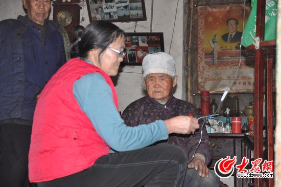 剛到東桃村,遠遠地村民就跟她打招呼,村民李愛華已經(jīng)在家等了一陣子了,給她打上針后,孫鳳蓮還給她灌上了一個暖水袋,李愛華的老伴沒在家,孫鳳蓮只好先給她輸上液,趕緊再上另一個病號家中,等會兒再回來給她拔針,又到另一個病號家,給他也輸上了液。不知不覺中,已經(jīng)是下午兩點半了,孫鳳蓮還沒吃上午飯,她仍然走在行醫(yī)的路上。