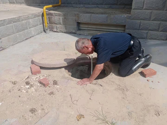 王允功在錦華十區為居民疏通堵塞的下水管道