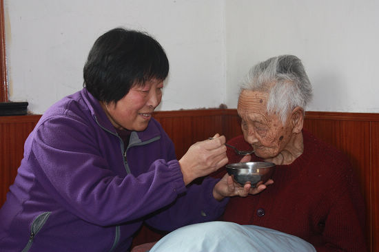 林紅春因?yàn)槟隁q較大,雖然記性很好,可是思想較為固執(zhí),所以別人說的話她不一定聽得進(jìn)去,“女兒”李日芳都會(huì)耐心的向老人解釋明白,只有她說的,老人才會(huì)從心底里信任和同意,所以李日芳每天除了洗衣、做飯、幫老人洗澡,就是和老人聊天,就這樣不是母女的人勝似母女。可是李日芳也有83歲的公婆,也有89歲的親生母親,沒能一直在跟前照顧她們,李日芳的心里很是酸楚和惦念,每次空閑出一點(diǎn)時(shí)間,她就會(huì)去看望一下公婆,順道也去看看自己年邁的母親。有一次,在看望81歲的公婆后,李日芳就想去看看現(xiàn)在住在自己兄弟家里的老母親,可是兄弟有事出去,大門落了鎖,沒辦法她只能趴在墻頭和院內(nèi)87歲的老母親說上幾句,之后又得立馬趕回家,因?yàn)榧依镞有一位百歲老人更需要照顧。