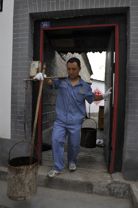 掏糞工是一個苦行當(dāng),不論是烈日炎炎,還是數(shù)九寒天,不管是刮風(fēng)下雨,還是雪花飛舞寒風(fēng)陣陣,他們每天都要挑著百余斤的糞擔(dān)走街串巷為居民服務(wù),“晴天一身土,雨天一身泥,冬天一身霜”是他們工作的真實寫照,苦點、臟點、累點且不說,由于世俗觀念的緣故,常常被一些人看不起,經(jīng)常受到社會上部分人的歧視和嘲笑。2002年,年僅20歲的于海轉(zhuǎn)業(yè)來城肥二處清潔四隊,成為一名挑糞工人。剛剛參加工作時,他承受的是臟、苦、累,面對的是閑言碎語、冷嘲熱諷,內(nèi)心壓力很大,變得沉默寡言。但是部隊的鍛煉和教育讓他頂住了壓力,默默承受與奉獻(xiàn)。在身邊老同志的幫助下,在居民贊許的鼓勵下,于海同志慢慢認(rèn)識到“工作無貴賤,行業(yè)無尊卑,用自己的雙手為人民群眾做點事,干什么不重要,重要的是干的事有意義”。于是他更加勤勤懇懇、任勞任怨,時時刻刻虛心向身邊的老黨員、老職工學(xué)習(xí),并將部隊“全心全意的為人民服務(wù)”的優(yōu)良革命傳統(tǒng)帶到了單位一線工作中。
