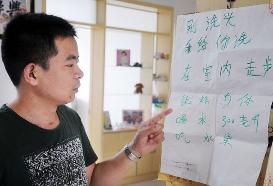就這樣,生活所有的壓力都落到了徐憲慧一個人的肩膀上。她依靠著一個妻子對丈夫的責任感、對孩子的愛堅強起來,挺起腰桿挑起了照顧一家人生活的重擔。剛出院回來的時候,丈夫只能臥床,徐憲慧每天給他喂飯、洗刷、按摩,幫助他上衛(wèi)生間,晚上幾乎沒有睡過一個好覺。在這一年多的時間里,丈夫因為病情發(fā)作又進了7次醫(yī)院,每次她都寸步不離。苦累的時候,她總會想起以前丈夫?qū)λ捏w貼,心里就又有了莫大的鼓舞和動力。如今,她最開心的就是經(jīng)過自己悉心照料,丈夫已經(jīng)有了一定的自理能力。