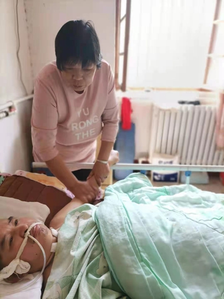 由于腦部出血過多,丈夫做了開顱手術,術后雖然保住了生命,但全身沒有知覺,也不會說話,成了植物人。她抹掉眼淚,咬牙堅持,默默的在醫院守了三天。但是為了減輕孩子們的壓力,她裝作一副樂觀的樣子,說:“爸爸會好起來的,放心,我一個人能頂得住,你們不要都在醫院守著,都回你們的小家,這里有我呢”。