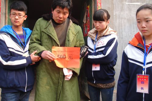2012年3月5日,該校組織學生代表,來到雙橋鄉(xiāng)黃崗村慰問了貧困家庭黃憲福,又給他剛出生就失去母親的雙胞胎孩子送去了五百元現(xiàn)金以幫其解決燃眉之急。