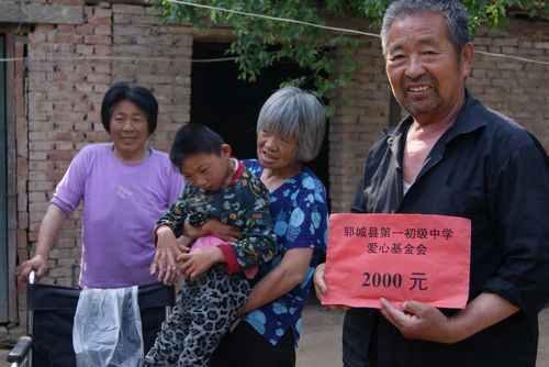 2011年5月28日下午,第一初級中學的6名師生代表,懷揣著全校3000多名師生賣飲料瓶和廢紙換來的2000元現(xiàn)金和部分生活用品,來到鄆城縣張營鎮(zhèn)張三村兩個腦癱兒童家中,為他們送去了沉甸甸的兒童節(jié)祝福。