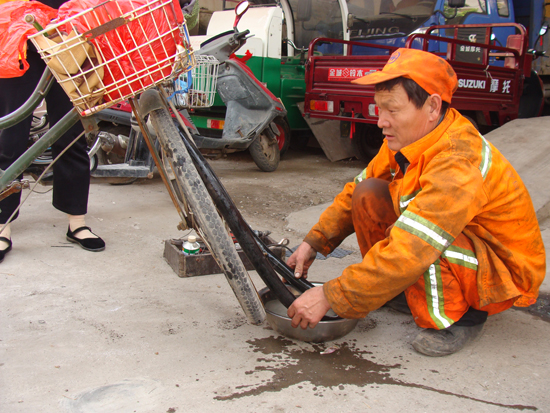 環(huán)衛(wèi)車隊現(xiàn)有各類用途、各種型號車輛10余部,車型多、結構復雜、維修量大。由于垃圾清運車輛每天都在凌晨四五點鐘工作,而且垃圾場中鐵釘之類的東西經(jīng)常扎破輪胎,為確保及時清運,不論早晚,車壞在哪里,他就帶著工具跑到哪里維修,無論寒冬還是酷暑,他都始終如一,一直堅持。據(jù)保守估計,每天以補一個輪胎計算,在他從事維修工作13年來,就一共修補了4300多個輪胎,笨重的輪胎卸上卸下,全是他一人完成,工作量之大,是常人難以承受的,長期的勞累造成他腰椎間盤突出,患上了嚴重的腰腿疼,可他卻沒有任何怨言。