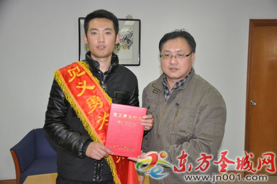 雖然兒子平安無事,但是,回到山西老家后,年輕的媽媽周女士卻始終忘不了報答救子之恩。周女士想出一個辦法———向天津市申請見義勇為獎,要讓大家都知道這個優秀的小伙子品德到底多么高尚!有了這樣一個想法后,周女士立即向天津警方以及天津市見義勇為協會求助,并將詳細情況向協會反饋。接到周女士提供的信息后,天津市濱海新區見義勇為協會在調查取證的基礎上很快就決定授予姜海龍見義勇為稱號。為了充分表彰這樣一位年輕的90后楷模,決定把這樣一份非同尋常的認定證書和1000元現金送到姜海龍的手中。2013年11月14日,或許,這個時間對于很多人而言都顯得再普通不過。可是,這一天,對于遠在山西的周女士而言,卻顯得格外重要。因為在時隔兩個多月后,她終于有機會見到救了孩子命的恩人,并且真誠地對他說一句———謝謝!