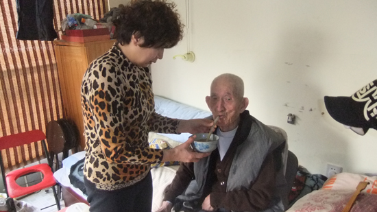 于霄寧今年30歲,為了照顧老人,選擇了一份在家里做兼職的工作。2012年于霄寧把房澤秋、李玉柱一起接到新家,因為只是兩室一廳,所以把客廳和陽臺打通,做好窗戶封閉,給老人安了一張床,這樣一來,不僅老人能感受到客廳一角的空調,還能看電視解悶。怕老人冬天凍著,還在老人腿邊放了一個電油汀取暖。