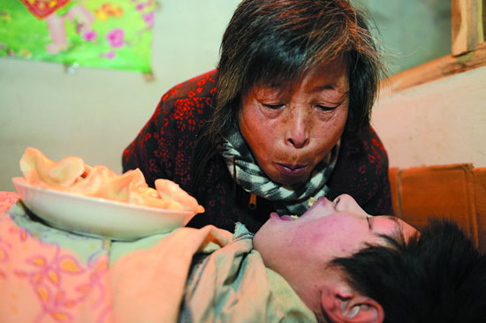 王均秀用炕頭上的大鍋蒸熱了餃子。然后,她端著上了炕。她將餃子咀嚼后,喂入招弟的口中,這頓飯花費(fèi)了近一個小時。像這樣的“程序”,王均秀每天得進(jìn)行兩三次。