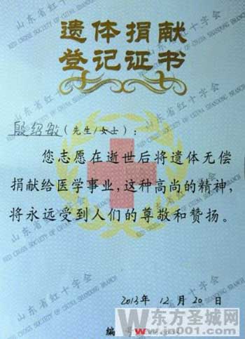 按照殷紹敏的遺囑,12月20日,濟南眼科醫院的醫生們完成了眼角膜移植手術,從此世界重新收獲了一雙明亮的眼睛。23日上午,濟寧醫學院接受殷紹敏的遺體捐贈,并立碑紀念。人走了,留下愛,他短暫的生命之花綻放出絢麗的光芒