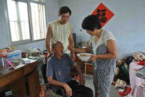 2005年,81歲的養(yǎng)母田玉蘭腦血栓臥床不起,生活無法自理,為了照顧養(yǎng)母,曹明美和藺祥亭不得不撇下工作。“從母親病倒開始,我整整三年沒干活,我們倆輪流照顧,母親身體比較胖,翻身、換尿布,一個人根本不行,一天有時候拉尿十幾次,不停地?fù)Q洗,我們從來沒耽誤過,一日三餐,都是盡量想辦法給母親吃點好的。”藺祥亭說。