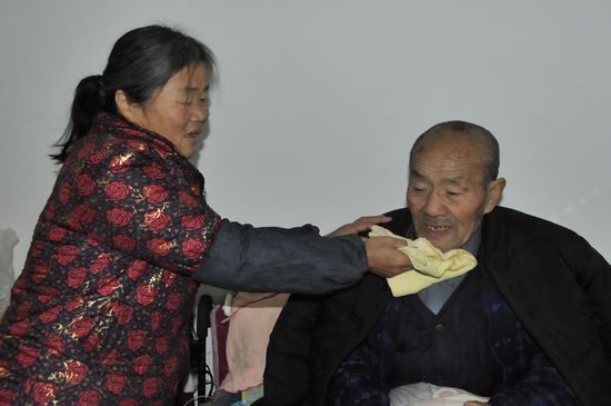 將賈孟光換下來的被褥和衣服洗凈曬到外面后,李玉梅又給老人喂下藥,并幫助他翻身休息。面對筆者,賈孟光幸福地說:"玉梅照顧我比閨女還周到。要不是她,我早就'摸到閻王鼻子'啦。"