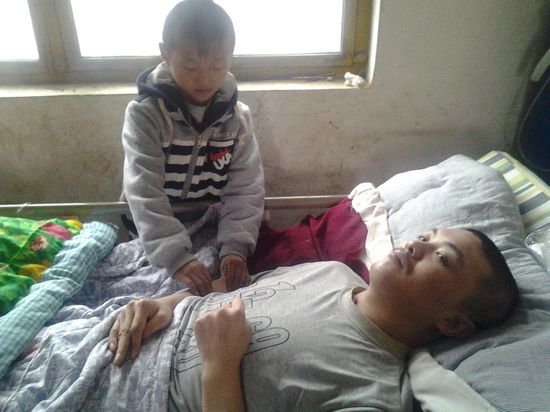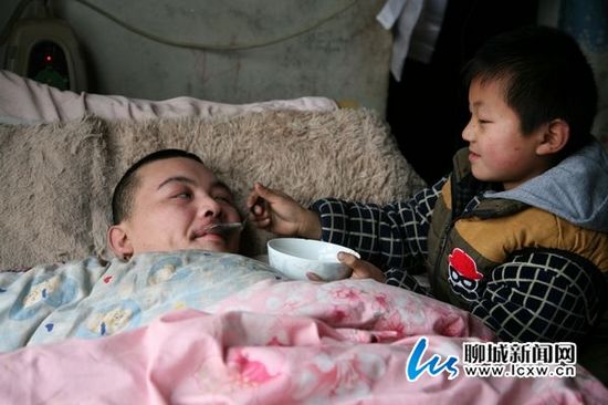 為湊夠爸爸每個月幾百元的醫藥費,媽媽選擇外出打工,照顧爸爸的責任就落在了小占順的肩上。給爸爸洗臉、擦背、喂飯、按摩、照顧他大小便、打掃家里的衛生、照看年幼的弟弟…這些成了小占順每天的必修課。為了不耽誤學習,每天小占順都是早早起來做家務,照顧爸爸和弟弟。聽媽媽說按摩有利于爸爸康復,只要有時間,占順都會給爸爸做按摩,很多時候手指累的酸痛,吃飯時連筷子都握不住。占順穿的是好心人送的舊衣服,吃的是自家地里種的菜,有時親戚送點肉,一家人吃上好幾天。占順知道自己的家庭條件,從來沒有亂花過一分錢。說到爸爸的病情,占順很樂觀。"我最大的愿望就是爸爸有一天能站起來。"他說,爸爸很堅強,一直在與病魔作斗爭,爸爸的病情也在逐漸好轉,原來只能用針筒往胃里打飯,現在可以用勺子喂爸爸吃飯了。占順每天放學后一有時間就給爸爸講學校發生的新鮮事,他相信爸爸總有一天會親口回答他。