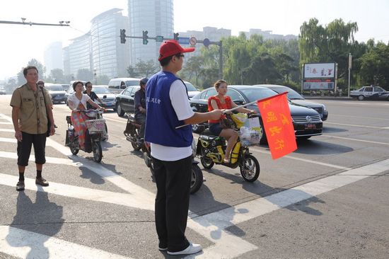 8月20日,萊蕪供電公司4名“愛心彩虹”青年志愿者頭戴小紅帽,身著藍馬甲,在長勺路與魯中大街路口,勸阻不文明行為,協助交警順暢交通。