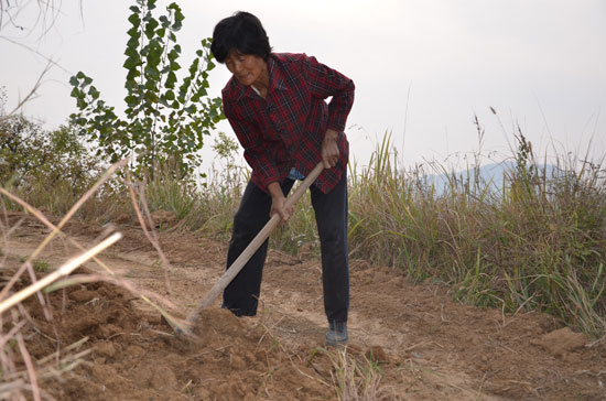 雖說這段山路只有50米長(zhǎng),但工程量一點(diǎn)都不小!山路旁的坡足有一人多高,要一點(diǎn)點(diǎn)鏟平;手腕粗的荊棘要一點(diǎn)一點(diǎn)刨出來,再清理到溝邊;因處山地,又怕土質(zhì)松軟而車輛傾翻,她又將清理出的石頭一塊塊壘在路邊護(hù)坡,有的石頭太大搬不動(dòng),她就一點(diǎn)一點(diǎn)的挪動(dòng),實(shí)在挪不動(dòng)就等丈夫空閑時(shí),讓他幫自己搬。修路期間正值夏季酷暑,她每天早晨吃完飯,就收拾好鍬、鎬、繩子,帶上水、飯上山。累了,就在背陰處歇歇;熱了,就坐到刨出的新土上沾沾涼氣;渴了,喝幾口涼水;餓了,就地吃幾口飯菜,在山上一待就是一整天。但是再苦再累,她都沒想過放棄,慢慢的窄的地方加寬了,陡的地方墊平變緩了,村民三輪車也能開進(jìn)去了,兩個(gè)彎道處還特意加寬了路距,村民上山耕作、收獲莊稼都更加方便。