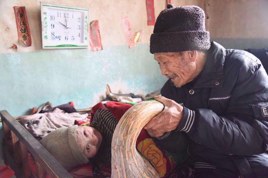 即便如此,杜元法對妻子的呵護(hù)也絲毫未減。夏天,杜元法擔(dān)心妻子會生瘡,天天給她擦洗身子。冬天天氣晴好時(shí),杜元法就把妻子抱到室外曬太陽。為了讓妻子的飲食更加豐富,杜元法在日常照料的同時(shí)還種著幾畝薄地,今年還種了很多南瓜。“給她煮點(diǎn)南瓜粥,有營養(yǎng)還好消化,她也愿意喝。”杜元法笑著說。
