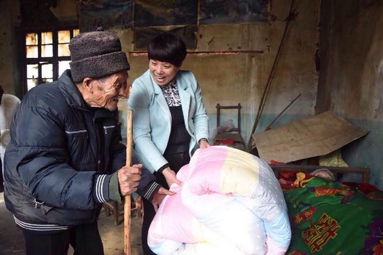 雙堠鎮(zhèn)黨委工作人員給老人送來新棉衣被,老人很高興。
