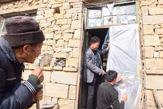 鄉(xiāng)親們?yōu)槎旁ɡ先碎T窗釘上薄膜保暖。
