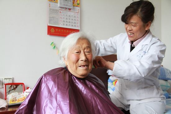 閆基艷生活照(為福利院老人梳頭)