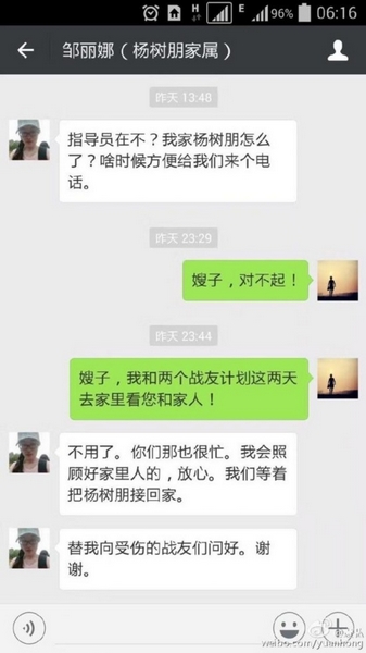 楊樹朋戰友與楊樹朋家屬的微信對話截圖