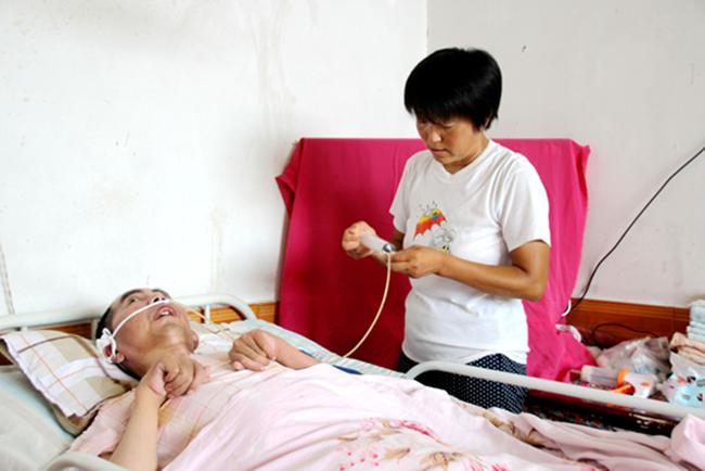 丈夫車禍后,因肇事方太貧窮沒有給予賠償金,而僅在住院治療期間,就花了40多萬元,家里能賣的幾乎都賣光了,還借遍了所有親朋好友。為了更好的照顧丈夫,她自己學(xué)會(huì)了按摩。六年來,她把大部分時(shí)間都花在丈夫身上,替他翻身、按摩、洗澡、換尿袋、用胃管喂牛奶等流食。