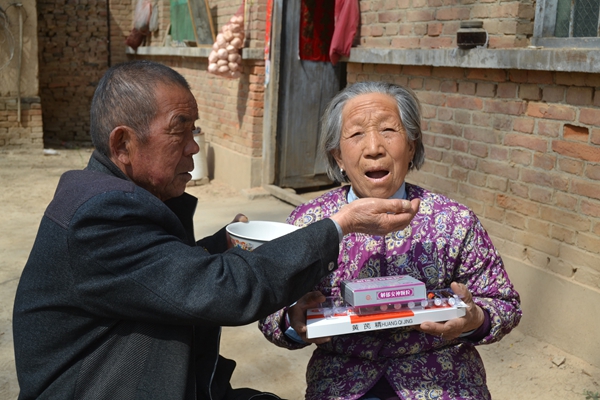 郭明林正在給80歲的養母喂藥
