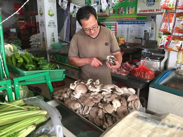每天早上進完貨回來,周積國和妻子兩個人總是要先把蔬菜整理一遍,把一些不新鮮的菜葉摘掉,蘑菇總是把根部先拿剪刀剪掉。周積國說:“剪掉這些我損失不了什么的,但是村里的人來買的時候卻能方便很多,最關(guān)鍵的是把那些不好的東西賣給別人我這良心上也過不去。”