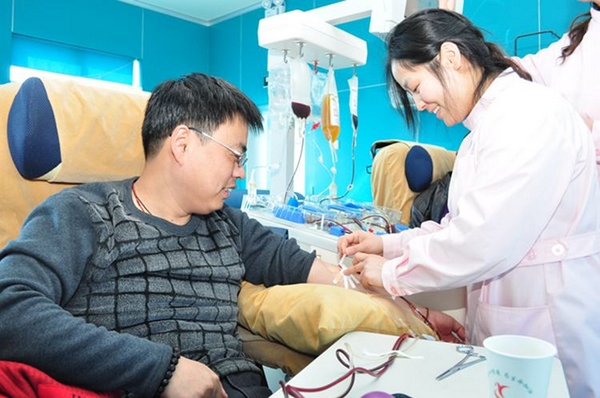 “一個人的生命危在旦夕,當(dāng)輸進你的血后,他又有了生的希望,這是無法用金錢換取的。”這是茍秀峰17年堅持無償獻血不間斷的動力源泉。2013年5月28日早晨,茍秀峰接到東營市中心血站的求助電話,由于近期血站儲量不夠,有危重搶救病人急需2個單位的成分血白細胞。茍秀峰二話沒說,請完假立即趕往中心血站。由于平時注重生活飲食,經(jīng)過嚴格檢查后所有數(shù)據(jù)都已達標(biāo)。雙臂消毒,分別插入導(dǎo)流管,身旁兩臺儀器同時啟動,一邊輸出鮮血,一邊將白細胞提取后血液輸回身體。足足4個小時,茍秀峰整個上半身不能動,腰酸了,就稍微挪動一下屁股,腿麻了,就輕微鉤鉤雙腳。采血結(jié)束后,茍秀峰的整個身體都僵硬了。他想到自己的付出,可以給他人帶來重生的希望,心里感到莫大的欣慰。