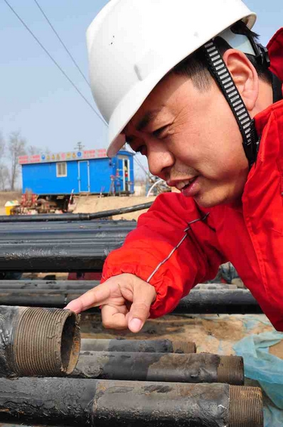 在施工井場,茍秀峰在檢查油管絲扣磨損情況