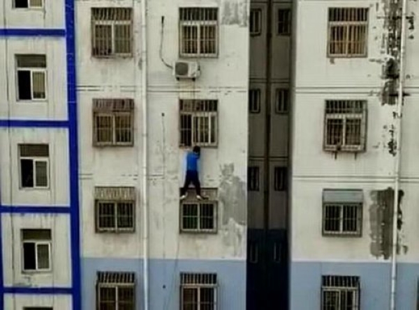 四樓窗戶上,一名2歲左右的男童頭部卡在窗戶防護欄中間,隨時都有生命危險,危急時刻,聊城教師梁磊毅然徒手爬樓,用雙手托起可愛的生命。