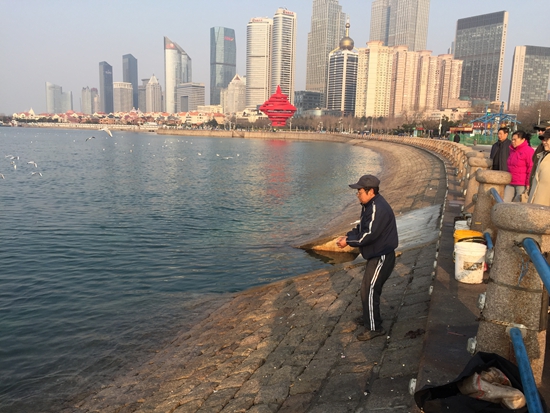 為避開高緯度嚴(yán)酷的冬季,海鷗每年10月遷來青島,來年5月北歸。正因如此,青島人在這大半年里都能看到海鷗。5年來,孫方成通過不斷摸索實(shí)踐,明白了大海鷗喜歡吃魚雜、小海鷗喜歡吃甜食。他總是在靜謐的凌晨,就把前晚整理好的魚腸、魚肚、五花肉,以及從飯店收來的剩飯菜分類裝進(jìn)涂料桶里,推著自行車往海邊走去。去年冬天零下14度的天氣,他為了把海鷗食拋得更高更遠(yuǎn)一點(diǎn),還像往常那樣光著手從冰凍的桶里往外摳魚雜,被魚刺扎破了手指,鮮血直流。因?yàn)榉磸?fù)受到這類傷害,他的兩個(gè)手指受了寒,雖經(jīng)治療,至今無法正常彎曲。有幾位晨練的老太太特意給他送來棉手套,為了拋食方便的他卻從來不用,因?yàn)榇魃狭耸痔祝zt食就拋不遠(yuǎn)。今年1月19日,孫方成向外拋食物時(shí),腳底一滑,跌倒在濕漉漉的防浪石塊上,因此跌傷了腰部,疼痛難忍,第二天過小年,他早晨一瘸一拐地還是推著自行車去了;海鷗早就等在原地了,看到孫方成一出現(xiàn),它們歡天喜地地?fù)砹松蟻恚瑖陬^頂上轉(zhuǎn)圈。每每看到這種場(chǎng)面,孫方成就會(huì)默默祈禱,愿天堂里的妻子放心:有我在,海鷗就餓不著——這里的風(fēng)景依舊。