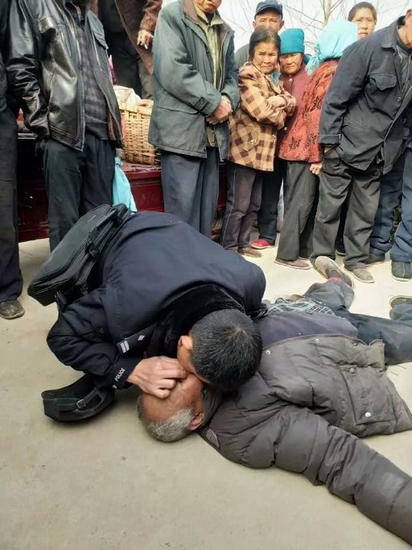 更讓趕集看到這一幕的群眾感動的是,醫護人員已經宣布老人離世,朱長波還是心有不甘地跪在老人身邊,看到他陷入悲痛回不過神,兩名群眾上前將他攙扶起身。